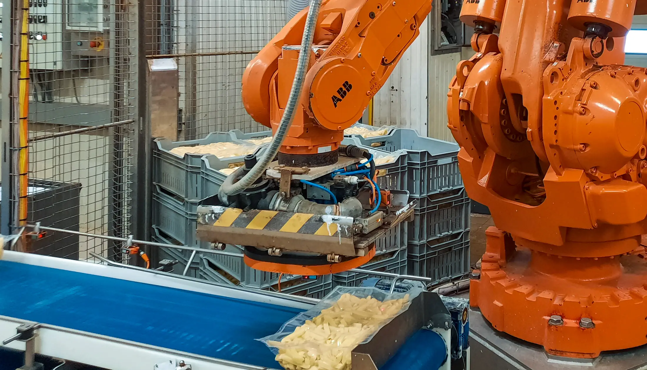 The customer’s request was to develop a completely unmanned system. It had to vacuum pack potato products in a very small, humid space at the end of the packing line. A custom-made handling robot with a mechanical gripper and vacuum support has been installed for this purpose. This has been extended with a modular conveyor belt system for stacking plastic crates and handling the packaging.