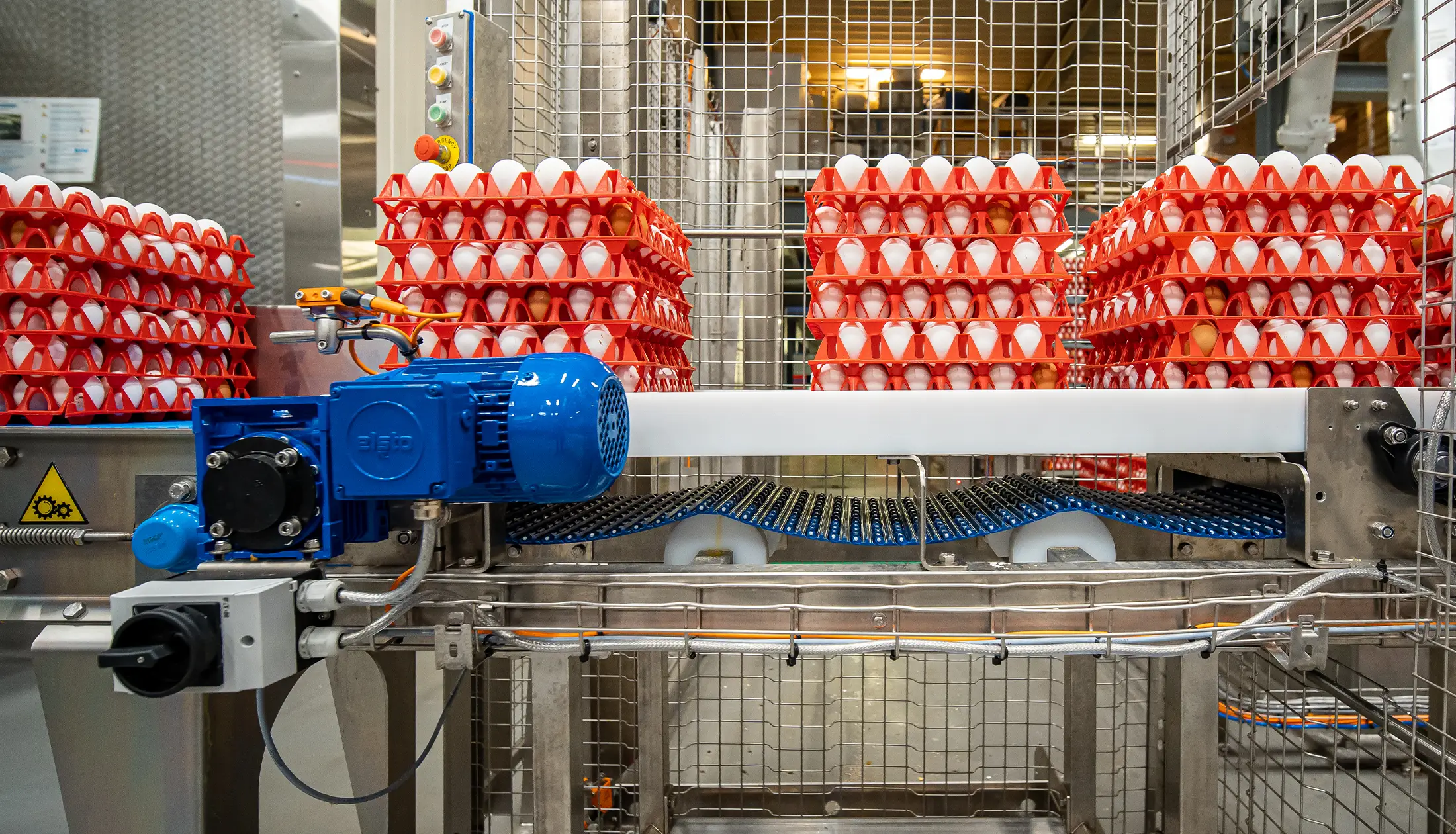 The challenge for this case was to eliminate the need for human intervention in the process. For the removal of empty packaging, such as trays, dividers and pallets, all crushing and washing machines in the process have been expanded with various input and lifting systems. This by means of a modular transport system with signal communication to the surrounding systems.